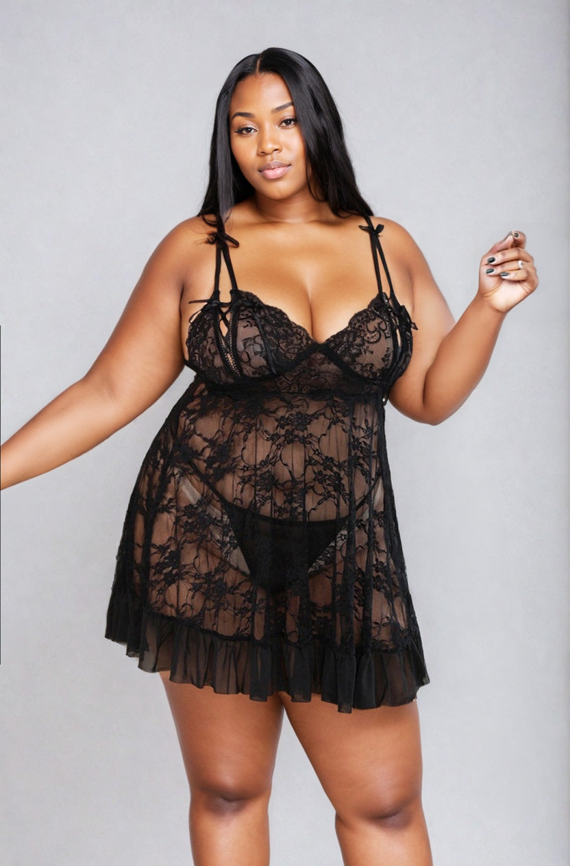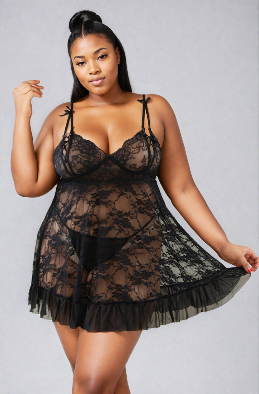 This plus size, black lace babydoll features structured cups, ruffled mesh trim, bow appliques, and panty.