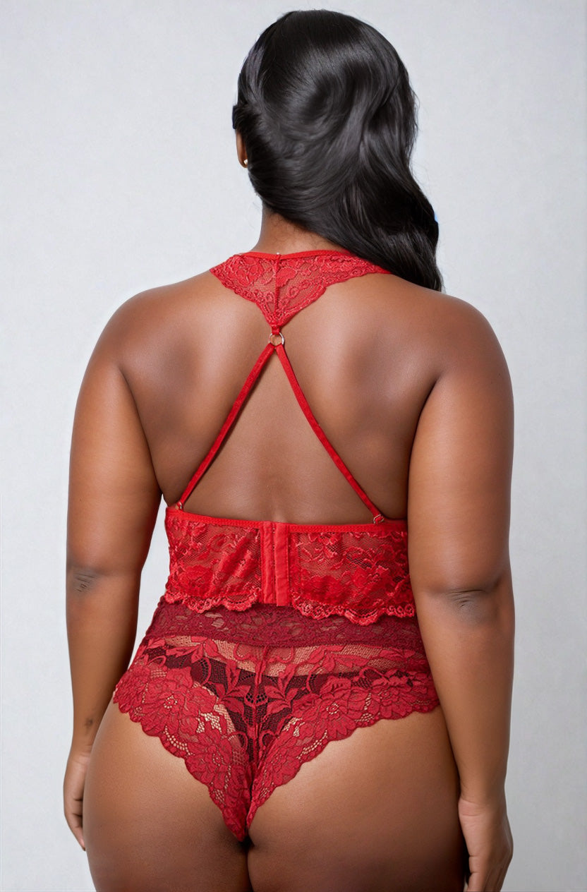 This plus size, rosey lace red bralette features scalloped lace trim. (Panty not included)