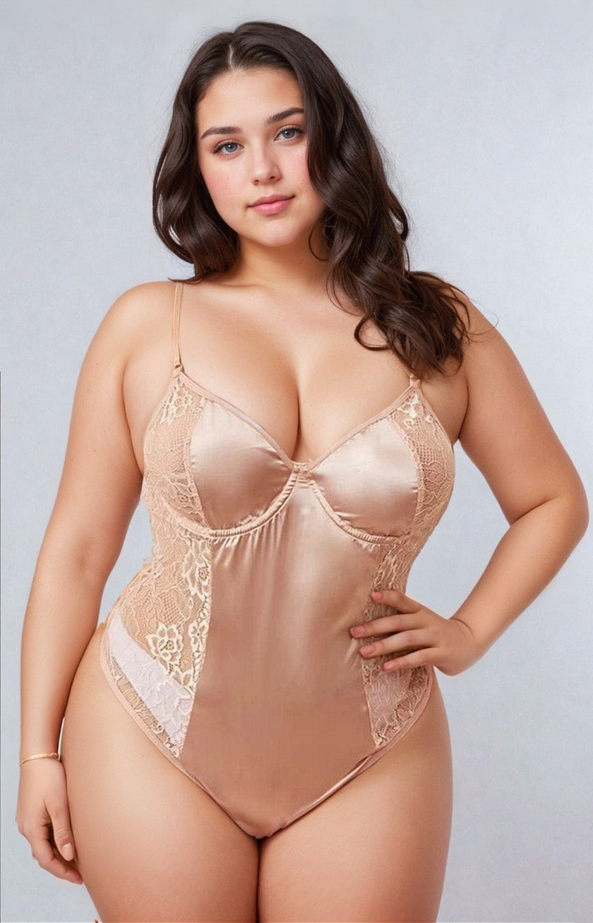 This pale pink, satin teddy features lace side panels and a cheeky back.