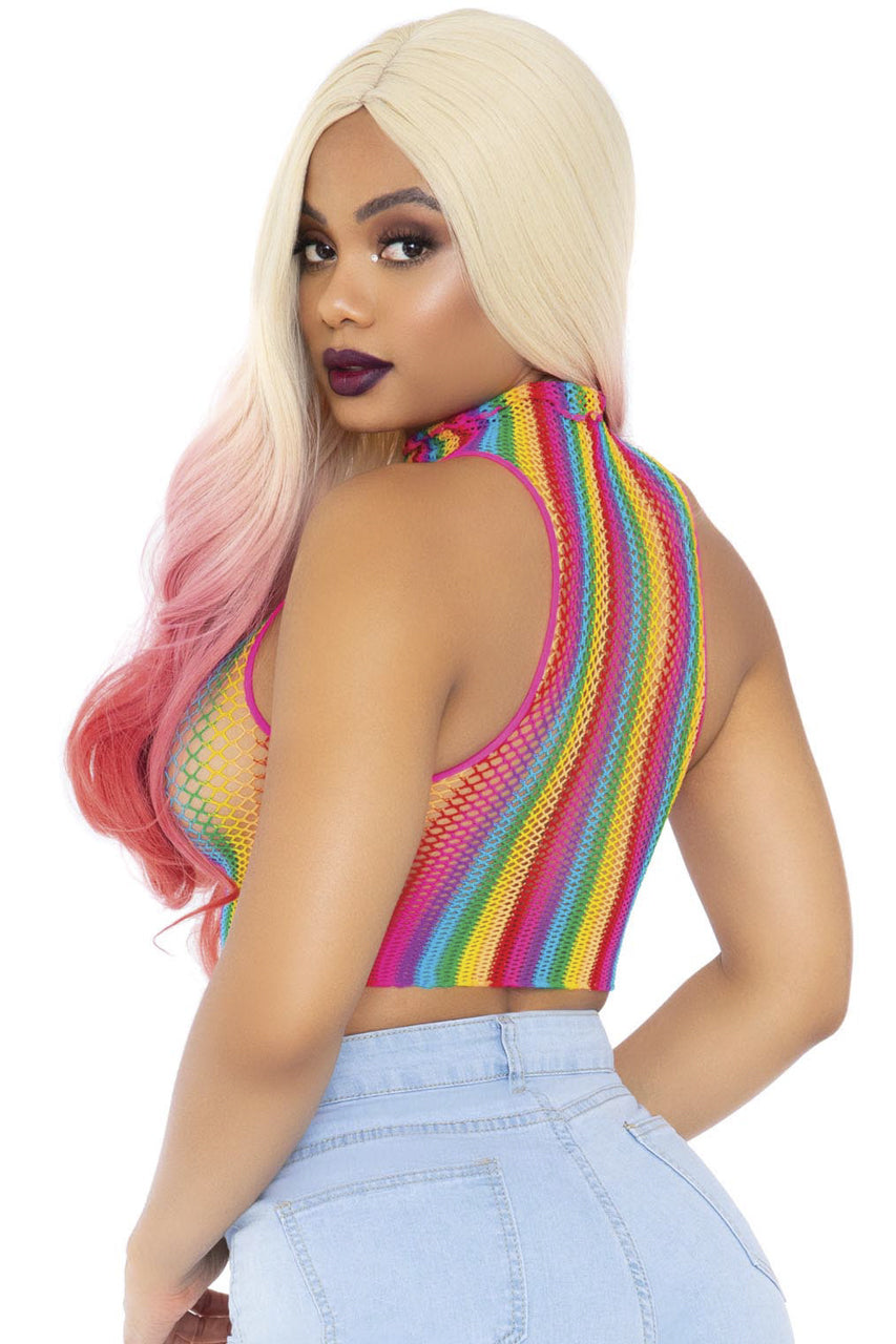 This rainbow fishnet, high neck crop top features a racer-style back .