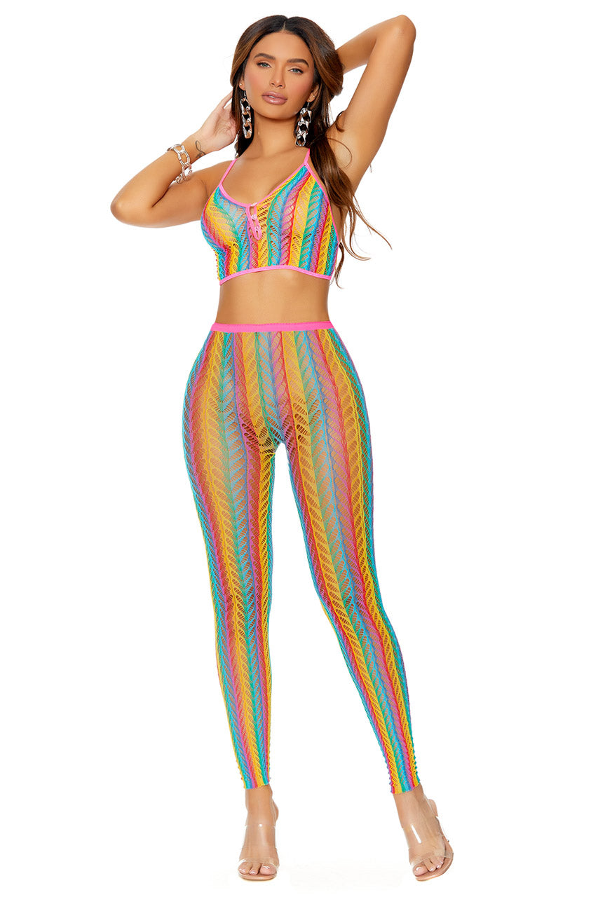 This fun, rainbow print net lingerie set includes a cropped cami top with button front detail and matching leggings.